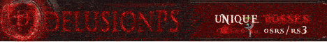 DelusionPS RSPS An up and coming runescape private server. Great community and super active owner. Come join us today and enjoy the great benefits of being a member of our community, including but not limited to; Fully working PC & other minigames! World bosses featuring our very own Infinity Beast! Custom Bosses including Skotizo and Heartwrenchers! Custom Raids Custom items Custom Pets that also increase drop rate! Upgradable gear and other items INCLUDING donor scrolls! Weekly updates Super active and friendly owner and staff All working skills (dungeoneering in process!) Custom ranks with bonuses for different ranks (can get up to uber without even donating!) Come join us today and enjoy the minimum weekly updates! 10+ online daily and we've barely started! We are looking forward to seeing you soon! Your newest adventure awaits! Feel free to join us on our Discord server!